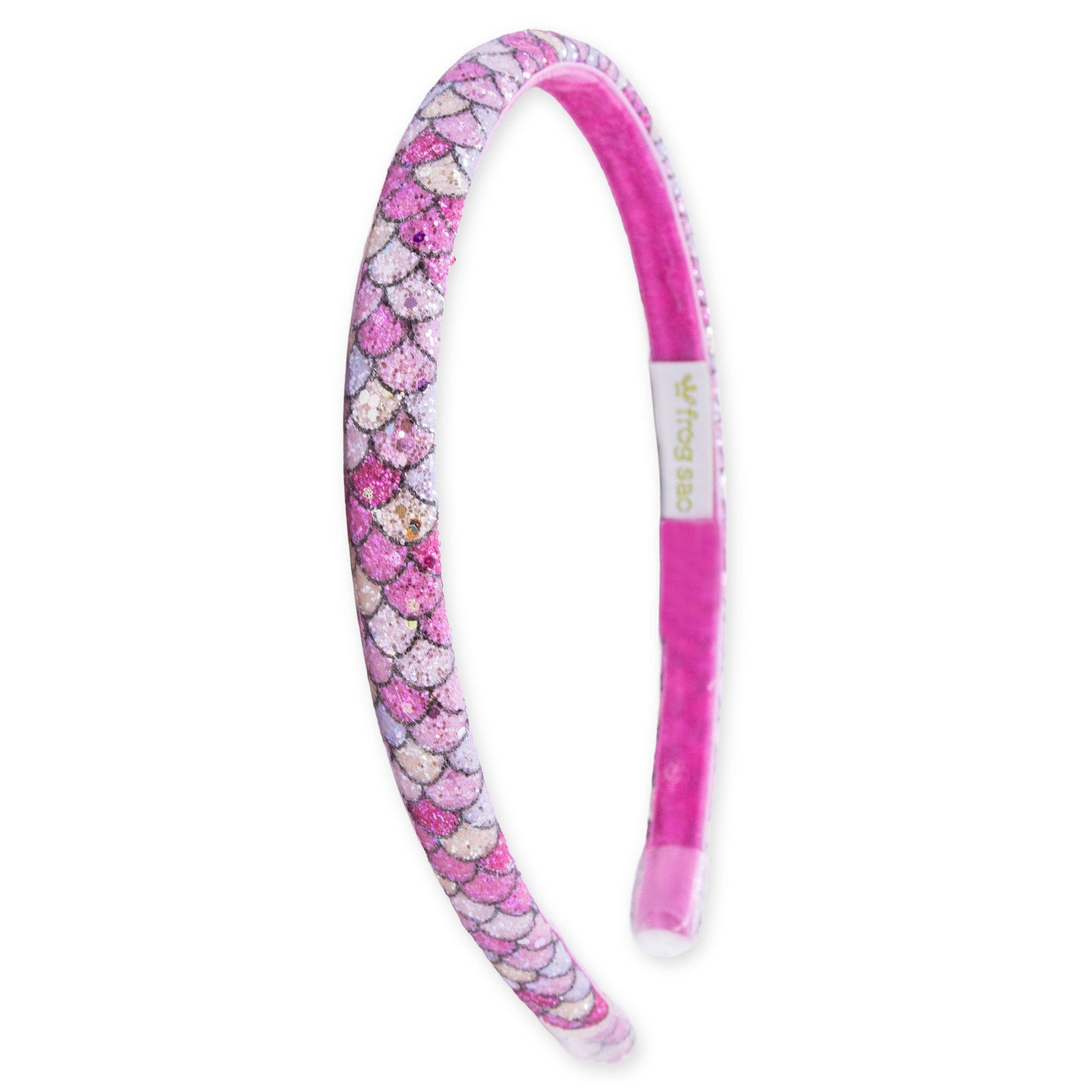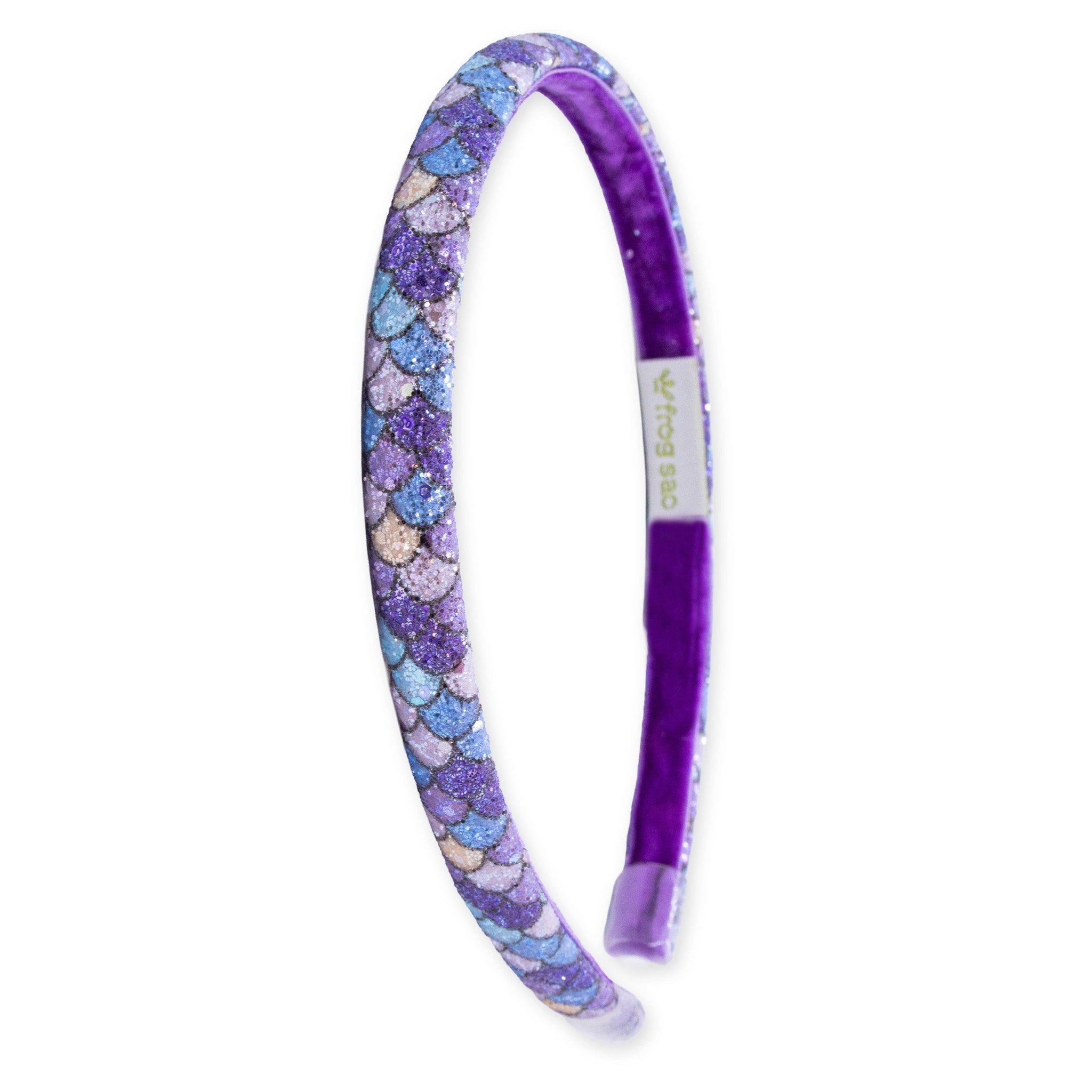 * Thin headbands for girls * Glitter mermaid scale patterns * 4 colors - Fuchsia, Purple, Blue, Teal Green * Sold by the piece * Flexible 13" size to best fit kids to teens * Thin 0.5" width headband * Non slip inner velvet lining * Clear end caps for comfortable all day wear * Unique padded style hair band Perfect for children's fashion boutiques, toy stores, hair salons, and gift shops.
