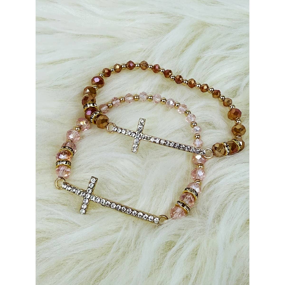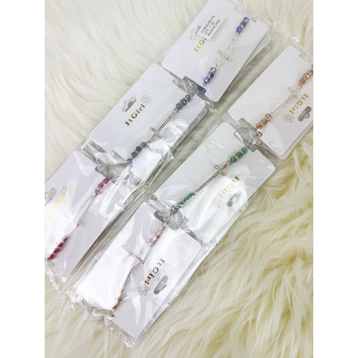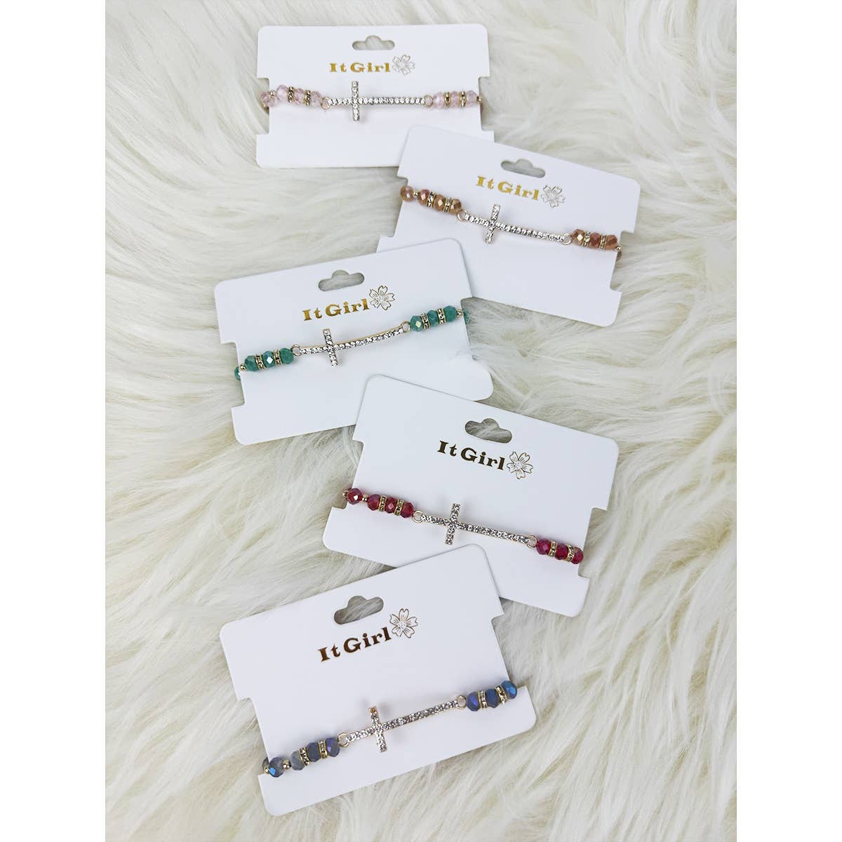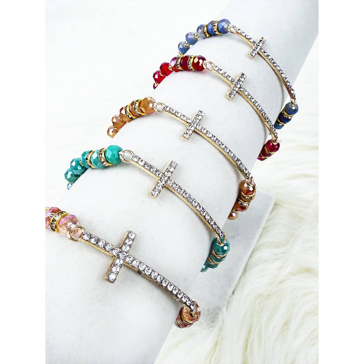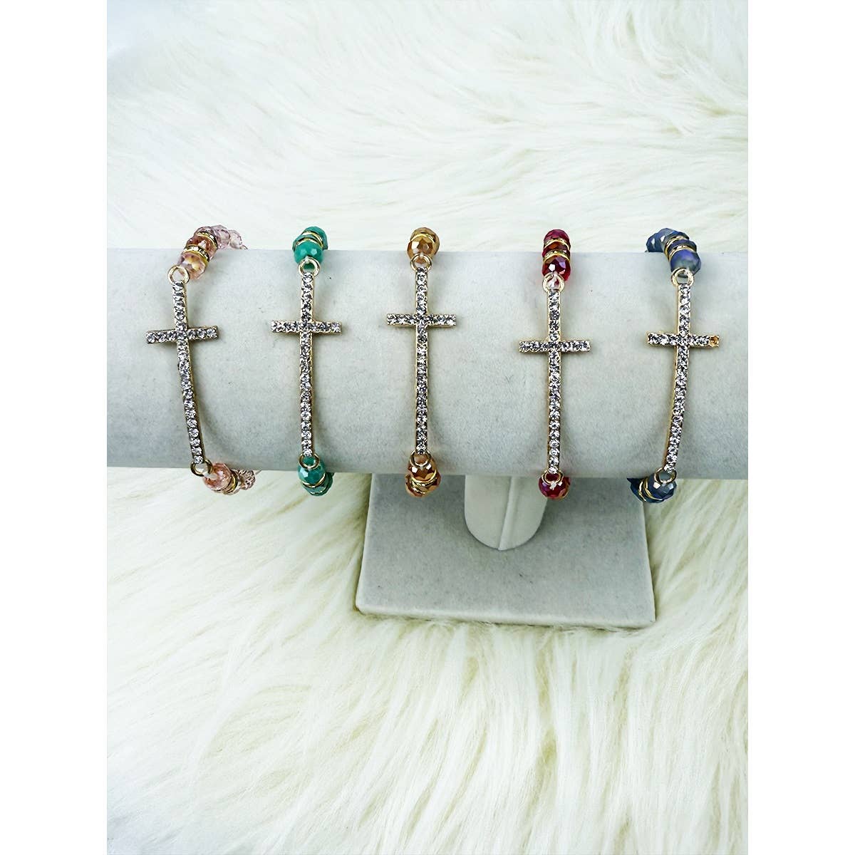 Rhinestone Gold Cross Multi Tone Beaded Stretch Bracelet -Stretch and elastic design, comfortable to wear, minimalist stretchable beads string, perfect for stacking, a stunning accessory to elevate your style. -6 Colors Cross Bracelet Assorted