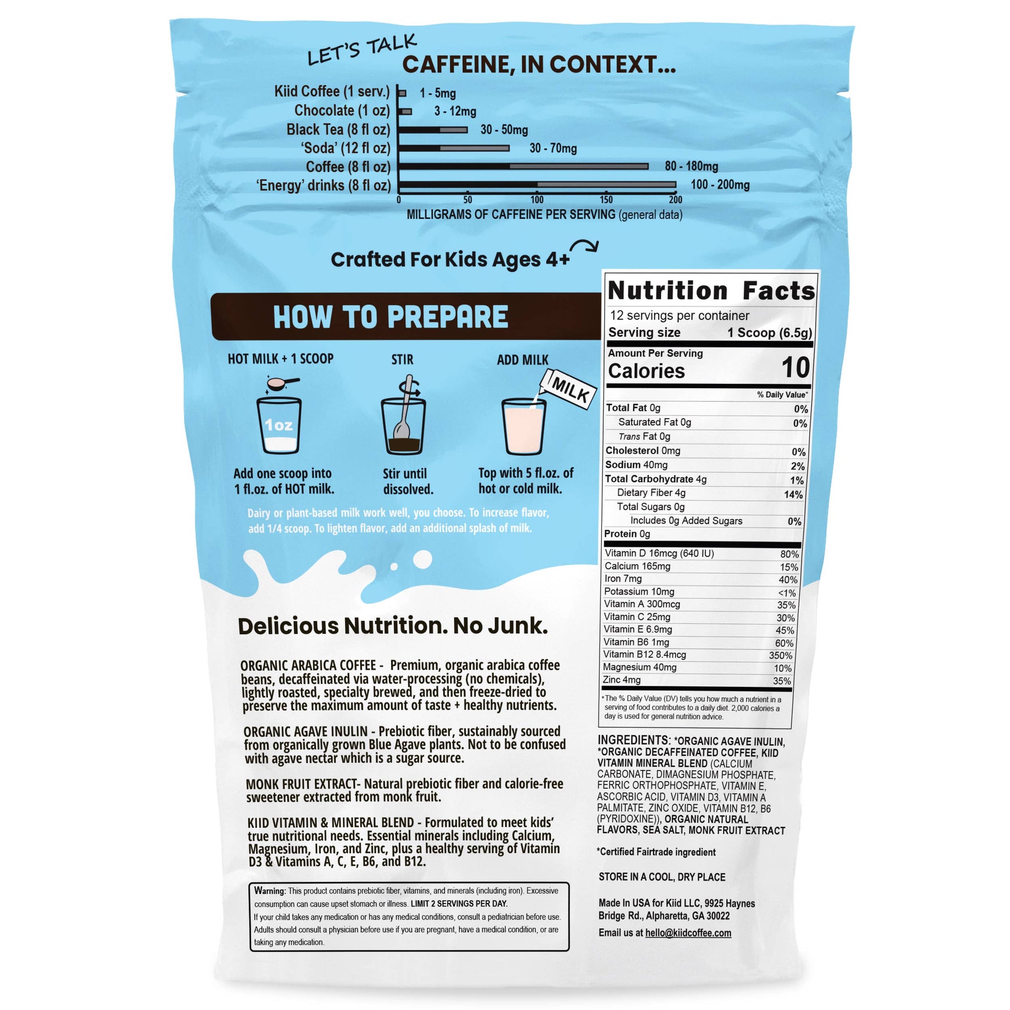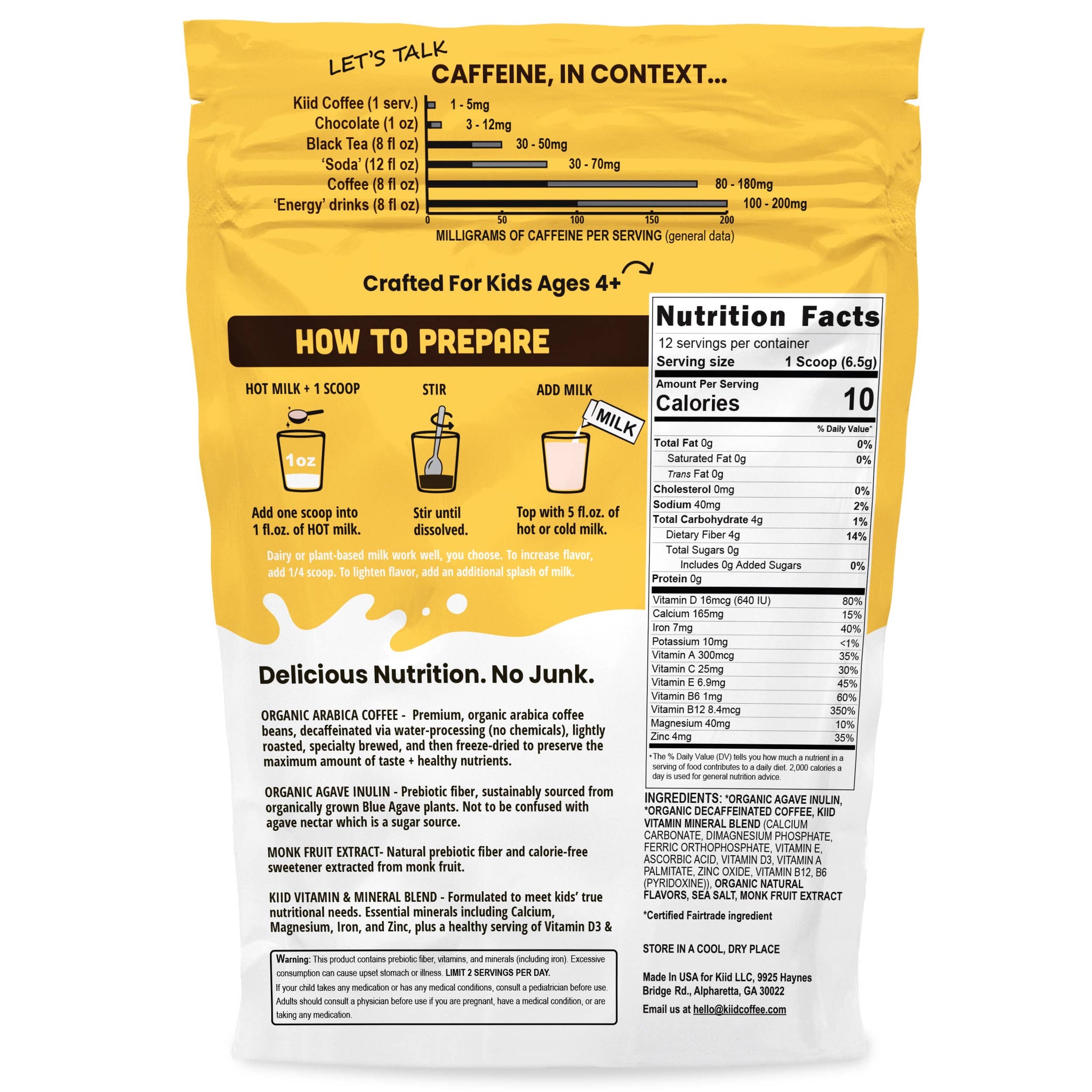* 99.9% Caffeine-Free via water-process decaffeination. Kiid Coffee has less caffeine than 1 ounce of chocolate, without any nasty chemicals.